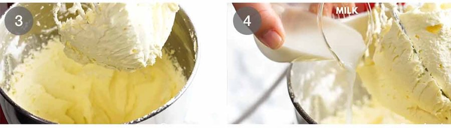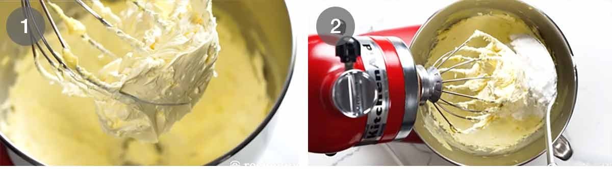 - Cream butter – Beat butter with paddle attachment in stand mixer for 3 minutes on high until it changes from yellow to almost white, and it becomes fluffy and creamy. (Note 2)