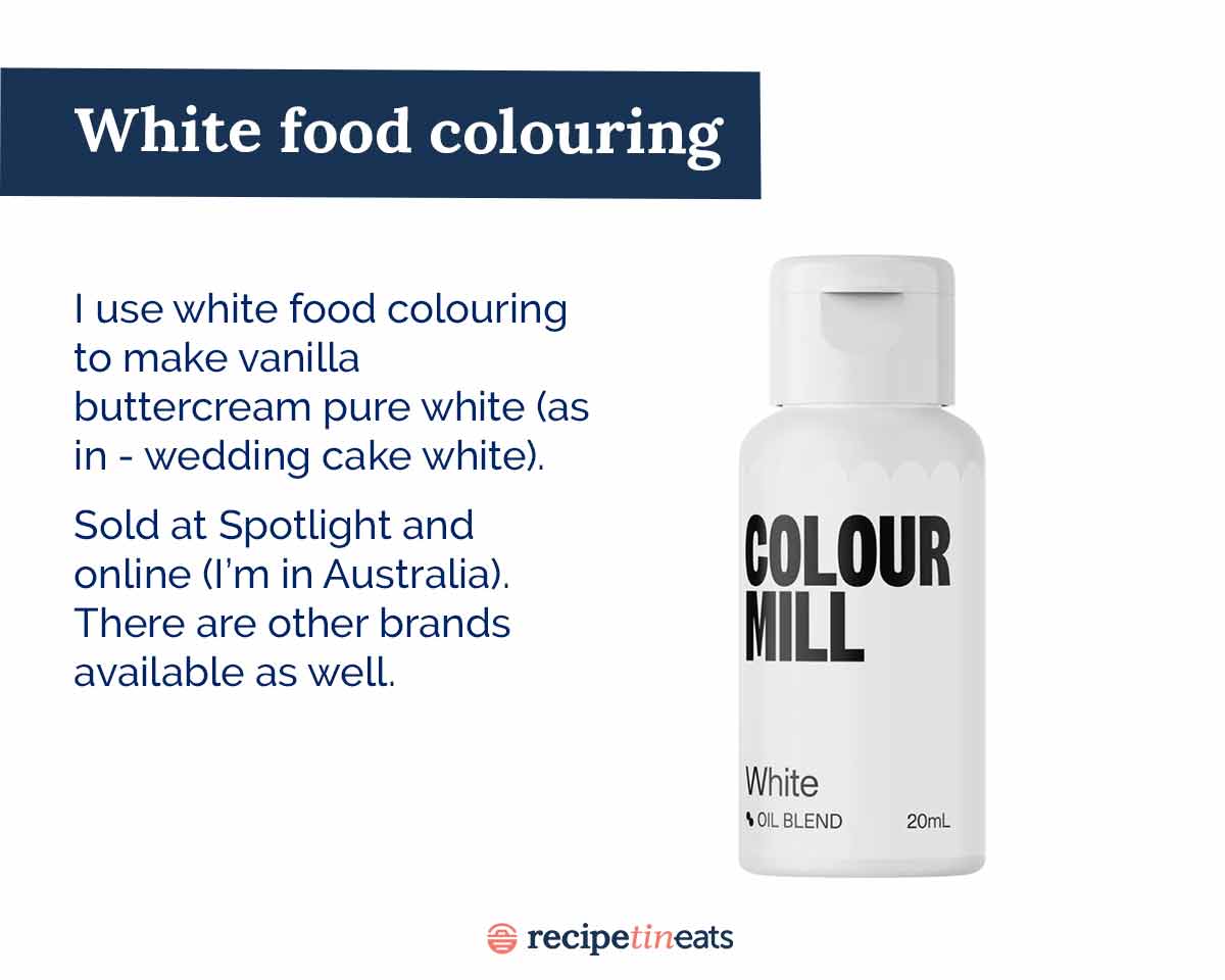 - Make it pure white – Vanilla buttercream is not pure white because of the butter and vanilla extract (which is brown). To make it pure white (like wedding cake white!) use a white food colouring (like this one). To make it whiter without using colouring, use a pale yellow butter (like Lurpak). You can also use a clear vanilla extract if you can find a good one which I have yet to find (most are imitation essence).